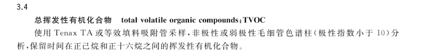 ①目前国家标准中涉及TVOC的都是指室内空气限值,TVOC目前是没有国家污染物标准监测技术规定的(但是福建省有地标—DB35/T 1746—2018),先看看《室内空气质量标准》(GB/T 18883-2002)中对TVOC的描述,