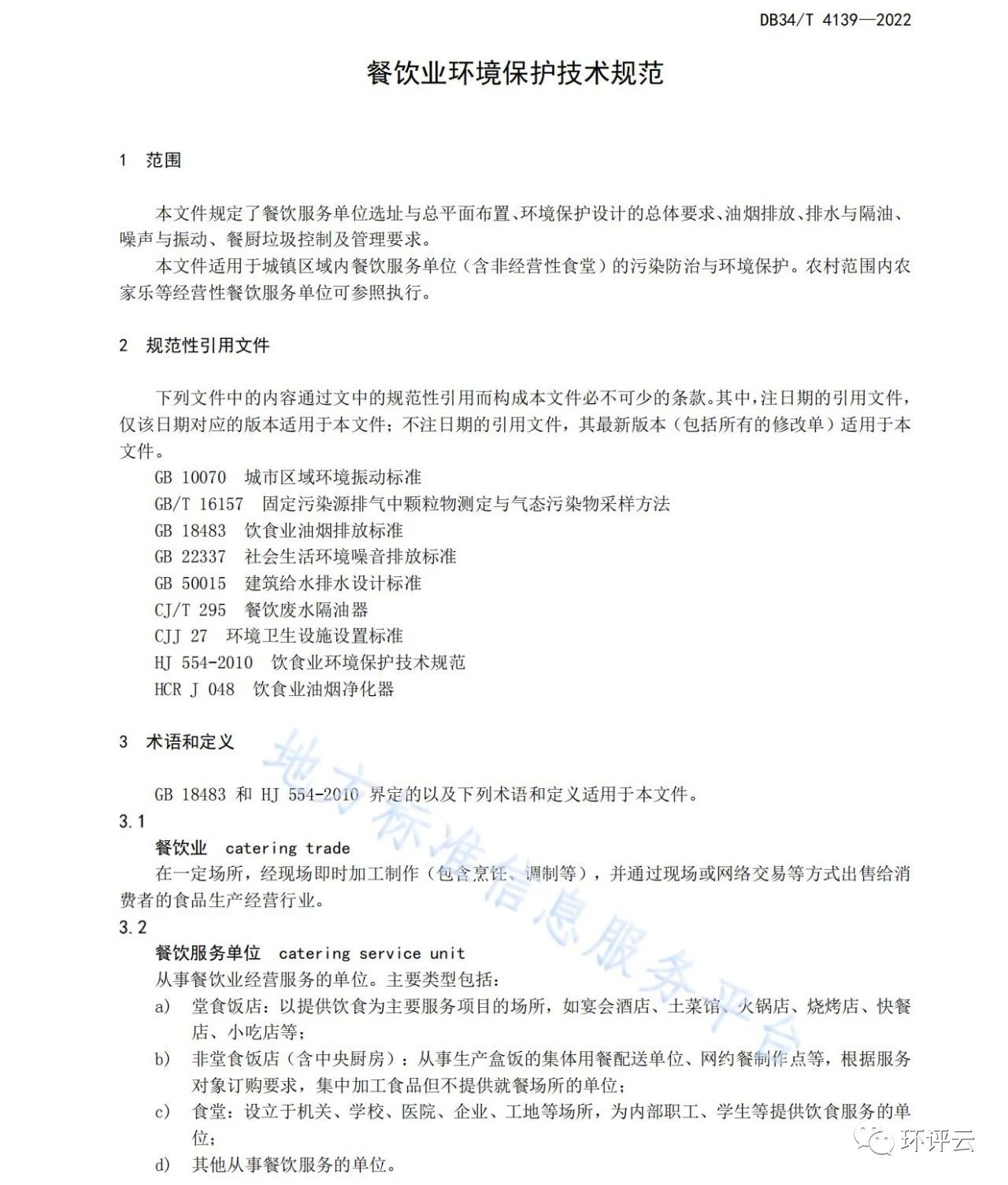 日前,省市场监督管理局发布了安徽省地方标准《餐饮业环境保护技术规范》(以下简称《规范》,编号为DB34/T 4139-2022),2022年4月29日起实施。答:随着我省近年来经济的快速发展,人民生活水平日益提高,餐饮服务业如今已成为市场化程度高、持续增幅大、受社会关注度广、对国民经济其他行业贡献率大的消费领域内第一大行业。在丰富人民物质文化生活的同时餐饮业油烟、异味、噪声等环境污染问题也变得十分突出,成为了群众投诉焦点。同时,有研究表明餐饮油烟也是细颗粒物PM2.5的来源之一。《中华人民共和国环境保护法》《中华人民共和国大气污染防治法》《中华人民共和国水污染防治法》《中华人民共和国噪声污染防治法》《打赢蓝天保卫战三年行动计划》以及《安徽省大气污染防治条例》《巢湖流域水污染防治条例》等一系列法律法规、政策文件均提出加强餐饮业相关环境管理的要求。目前,我省餐饮企业运营过程中还存在净化效率偏低,油烟净化装置选型与安装不规范、不能定期运行维修保养等问题,缺乏一套相对完善系统的餐饮业环境保护技术规范指导餐饮企业合理规范地开展环境治理工作。因此,亟需出台相关标准规范,将餐饮业的环境保护监督管理要求标准化,切实有效地控制餐饮业经营过程中造成的各类环境问题,推动解决居民投诉、改善环境质量。答:本规范适用于城镇区域内餐饮服务单位(含非经营性食堂)的污染防治与环境保护。农村范围内农家乐等经营性餐饮服务单位可参照执行。答:本规范中规范性引用的文件凡是不注年份的引用文件,其最新版本适用于本标准。如“HCR J 048 饮食业油烟净化器”等引用文件,凡是未注日期的,按其主管单位发布的最新版本执行。答:一是深入贯彻国家、地方法律法规。如《中华人民共和国环境保护法》《中华人民共和国大气污染防治法》《中华人民共和国水污染防治法》《中华人民共和国噪声污染防治法》《安徽省大气污染防治条例》《巢湖流域水污染防治条例》等对餐饮业的相关要求。二是与国标体系相互协调。依据国家《饮食业油烟排放标准》(GB18483),在《饮食业环境保护技术规范》(HJ554 )原有框架基础上,通过新增、细化部分条款,制定适合我省省情的地方性《餐饮业环境保护技术规范》,以保障我省环境质量日趋优化。三是兼顾发展,合理可行。规范编制过程中,始终体现科学性、先进性、污染防治技术可行性,并充分实现社会、经济的可持续发展、保护人民的生活环境及健康。3.分别对餐饮服务单位营业期间产生的油烟异味、排水、噪声、餐厨垃圾提出控制及管理要求。问:《规范》的出台体现我省对餐饮业环境管理的哪些新思路?答:1.首次对异味进行了定义。餐饮服务单位在生产经营过程中挥发出使人产生不悦的气味即称之为异味,并给出了主要产生的类型。2.对餐饮业提出更新更全面的总体要求。根据《城市市容和环境卫生管理条例》第三十六条要求,提出餐饮服务单位宜采用天然气、液化石油气、人工煤气、电或其他清洁能源。根据《安徽省大气污染防治条例》第七十三条,提出餐饮服务单位的油烟气排风管道宜分区并相对集中设置,并置于专用井道内,不应排入城市污水或雨水管道。根据《中华人民共和国大气污染防治法修订案》第八十一条,提出新建单纯居民住宅楼及未设立油烟专用井道的商住楼或与居住层相邻商业楼层内禁止设置餐饮服务单位;现有住宅楼内不应新设置产生油烟污染的餐饮服务单位。3.细化了各类污染防治措施的设计、选型要求。针对不同的厨房炉灶提供了相对应的油烟净化集气罩选型要求。提出餐饮服务单位排水及隔油设施的设计和选型要求。对餐饮服务单位经营过程中使用的产噪设备提出降噪及安装方位要求。对经营产生的餐厨垃圾临时存放场所、容器提出具体要求。4.量化了油烟净化器维护期限。改变现有油烟净化设备维护保养的时间 “一刀切”现象,首次提出具体量化指标,利用燃料使用量来反映餐饮企业的实际经营情况,并根据相关数据确定维护保养时间。5.提出油烟异味、排水、噪声及餐厨垃圾相对应的管理要求。要求餐饮服务单位应建立油烟净化设施、排水隔油设施、餐厨垃圾的管理台账并至少保留1年备查;安排人员对各个产污环节进行日常的维护保养及巡检工作(并提供了油烟、餐饮废水、餐厨垃圾维护、巡检台账示例),要求企业对产噪设备进行日常维护,发现异常立即修复。答:《规范》的编制采用了科学性和可行性的原则,主要从强化我省餐饮服务单位油烟异味、排水隔油、噪声振动及餐厨垃圾的管控操作细节、加强自主清洗维护等方面提出具体、量化可操作的要求,对各类污染物的净化处理设施设备提供了优化选型的建议,有利于餐饮服务单位加强各类污染物的排放管控,提升管理水平,形成良性循环,从而促进餐饮业污染物有效减排,化解社会矛盾,构建和谐社区关系。